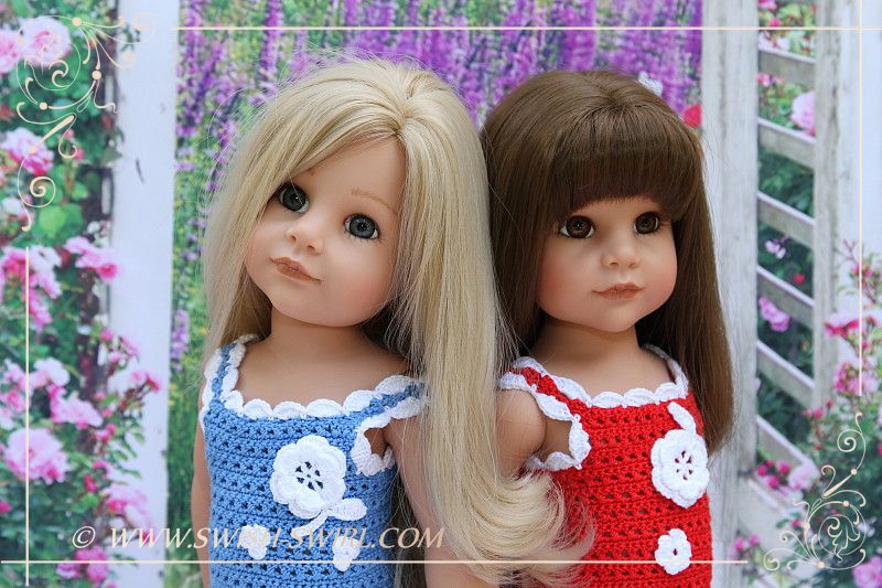 Я подумала что будет интересно сфотографировать двух моих Ханн (Гвендолен и Каролину) в одинаковых платьях. Оба были связаны моей подругой kotyanya_a. Синее платье она связала специально для меня, поскольку мне очень понравилось ее первое платье (практически идентичное этому), которое она связала для моего магазинчика.