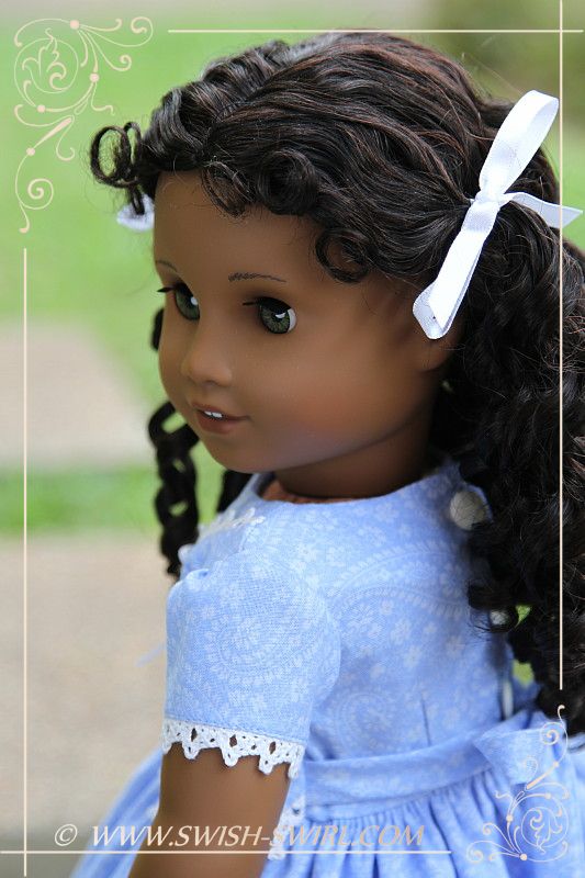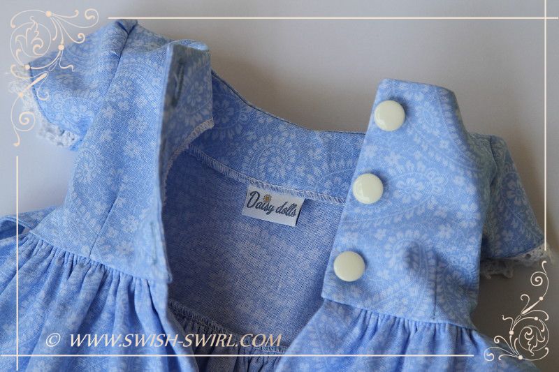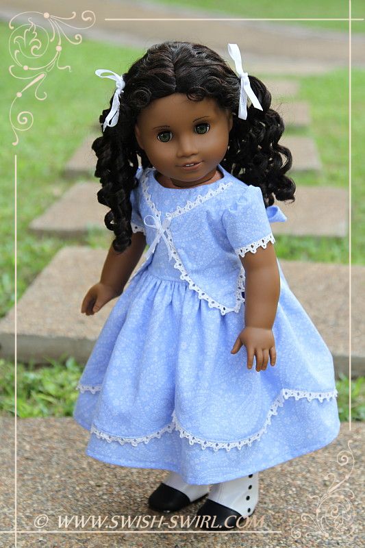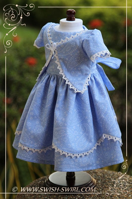 Это платья для меня особенное. Я сшила его по выкройке Keepers Dolly Duds. Когда-то давно я увидела другую Сесиль в похожем голубом платье. И сразу же влюбилась в обоих (куклу и платье). Позже я узнала, что существует выкройка для этого платья. И когда у меня поселилась Сесиль, я не представляла для нее другого платья! Ткань я нашла не сразу. В конце концов, я купила метр чудесной васильковой ткани в местном магазине пэтчворка — мне очень понравились цвет и рисунок пейсли на ней. Белое хлопчатобумажное кружево было куплено в Thimbles and Acorns — еще одном потрясающем месте исторических выкроек для кукол.