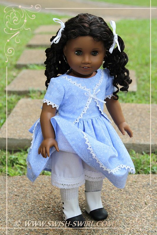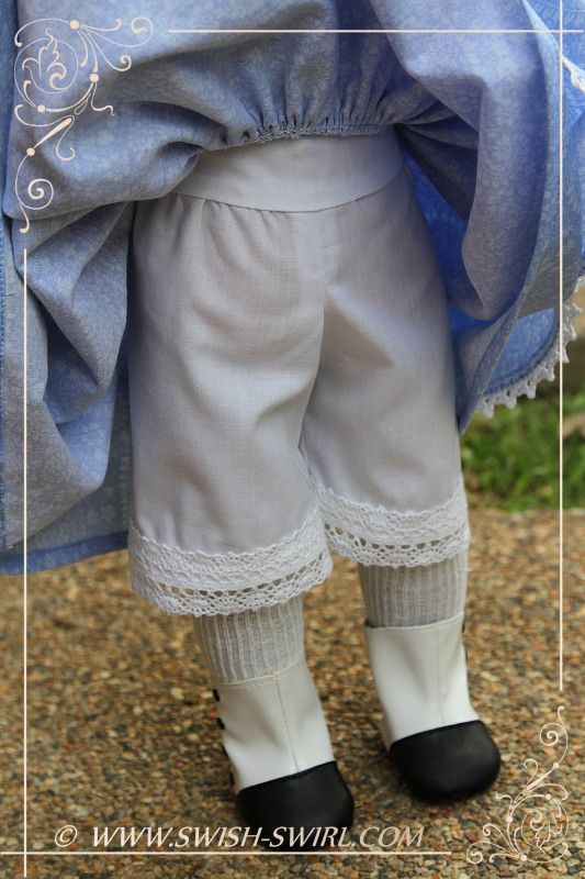 Я также сшила панталоны к платью — по выкройке Thimbles and Acorn. Они застегиваются сзади на пуговицу. Носки и ботинки сделаны компанией Американ Герл (носки принадлежат Сесиль, а ботинки были позаимствованы у Мари-Грейс).