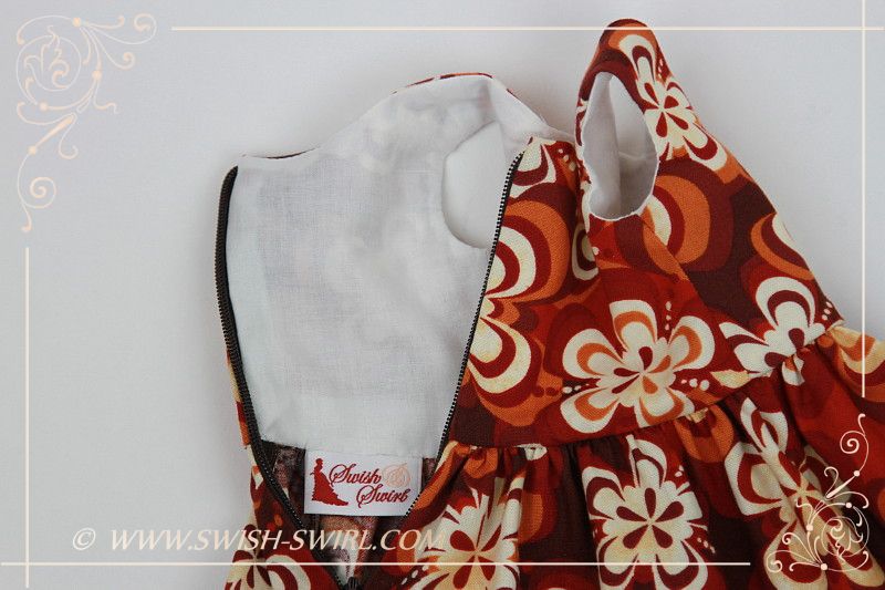 Платье сшито из высококачественного хлопка и имеет подкладку из белого батиста. Платье застегивается сзади на молнию. Белый пояса не пришит к платью и сделан из белого хлопка.