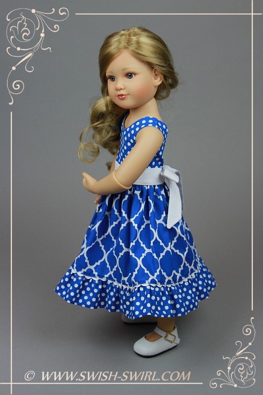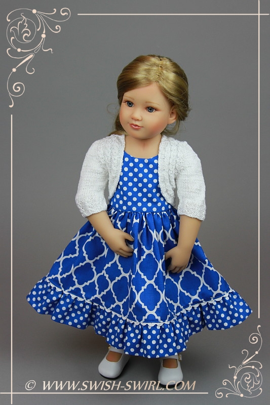Платье застегивается сзади, как обычно, на молнию. Белый пояс можно носить по-разному (или не надевать вообще!). Мне очень нравится сочетание двух синих тканей в этом платье. Белое болеро было связано моей мамой.