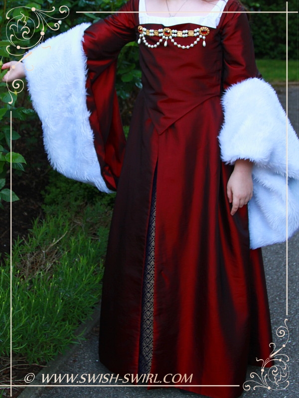 Итак, это платье состоит из двух отдельных частей: нижнего платья и верхнего платья. Я упростила некоторые детали, чтобы платье было более удобным и не таким тяжелым для дочки. Нижнее платье состоит из простого белого топа (из батиста, на подкладке из той же ткани) и юбки со вставкой из парчи (остальная юбка сшита из хлопка калико). Нижнее платье имеет шнуровку по обоим бокам. Верхнее платье сшито из полиэстровой тафты с подкладкой из хлопка такого же цвета. Большие рукава сшиты из белого меха (и они реально тяжелые!). Ширина юбки верхнего платья — 3 метра, и она полностью на подкладке. Мне пришлось разложить ее на полу через всю гостиную, чтобы приметать подкладку к основной ткани. Верхнее платье имеет скрытую шнуровку спереди, которая потом закрывается передом платья (которое пришито с одного бока и застегивается на 5 юбочных крючков с другого бока). Украшение спереди — это единственное, что не было сделано мной. Я прикинула и поняла, что дешевле было купить готовое украшение ручной работы, чем покупать все необходимые детали для него оптом и потом использовать всего несколько из них. Я купила это украшение на Etsy, и оно приехали аж из Канады! Вот магазин, где я его нашла.